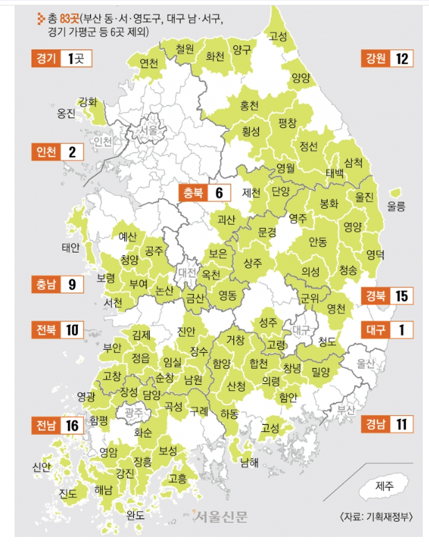 이들지역은 인구증감률,인구밀도,청년순이동률,주간인구,고령화비율,유소년비율,조출생률,재정자립도 등 8개의 지표를 바탕으로 선정되었습니다. 단순히 인구가 줄어드는 지역이 아닌 청년이나 유소년 인구,출생률등은 감소하면서 노인층 인구비율이 늘어나면서, 재정자립도가 하락하여 정부에서 특별관리하기로 한 지역들입니다.